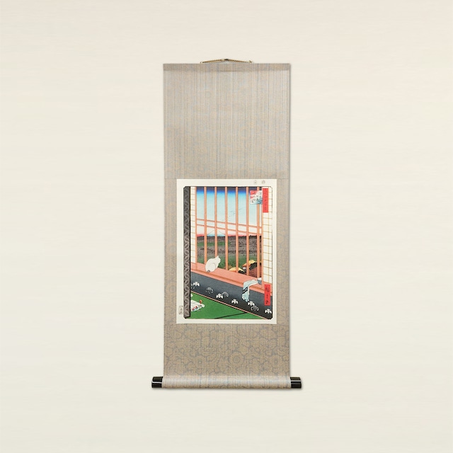 KAKEJIKUYA × 歌川広重 UTAGAWA Hiroshige 本紙:和紙ジークレー印刷 本紙サイズ:W250×H360 掛軸サイズ:W310×H795 (軸先含W360) 表装形式:袋表装 軸先:塗軸(木製) 箱:紙箱 納期:ご注文後2営業日以内発送 ◆掛軸について◆ 名所江戸百景の中でも、その独特な構図で知られる名作です。 吉原の窓辺に座る一匹の白猫と、その向こうに広がる酉の町の賑わい。 窓枠をフレームに見立てた映画のワンシーンのような描写は、現代の感性で見ても驚くほど新鮮です。 高精細な和紙プリントにより、夕暮れ時の淡いグラデーションや、遠くに小さく描かれた富士山のシルエットまで美しく再現しました。 作品自体が「窓の外を眺める」構図のため、壁に飾ることでお部屋に不思議な奥行きが生まれます。 現代のインテリアとも相性が良く、洗練された「和」のコーナーを演出します。 作品を包むのは、落ち着いたトーンのグレーの裂地。 繊細な紋様が単なる無地にはない奥行きと気品を演出します。無彩色であるグレーは、作品の中の静けさを強調し、どんなインテリアスタイルにも品よく調和します。