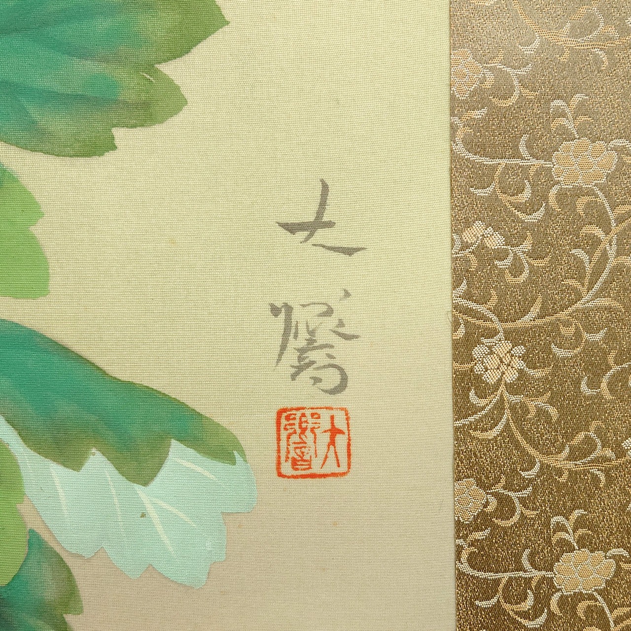鮮やかな黄金色に咲き誇る二輪の菊。端正な姿と力強い生命力を感じさせる一幅です。菊は長寿や高貴さの象徴とされ、古くから日本の美意識の中で愛されてきました。