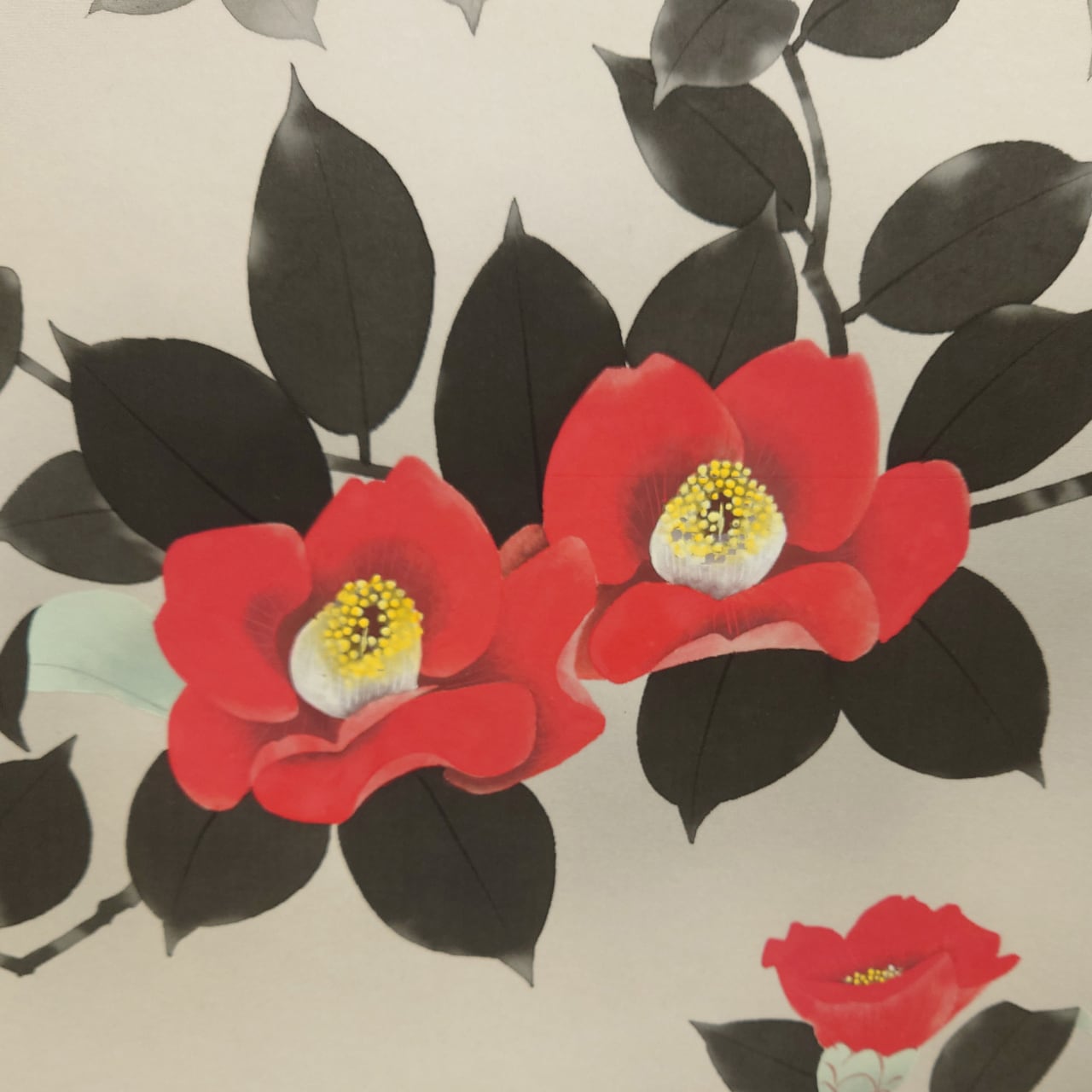 深紅の椿が鮮やかに咲き誇る一幅。雪を思わせる白の裂地で仕立てることで、赤い花の美しさが際立ち、凛とした気品を感じさせます。冬の静寂の中に咲く椿の力強さと生命力が、見る者の心を惹きつけます。
