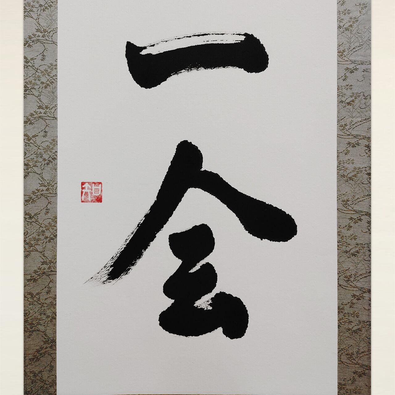 「一期一会」の書を、落ち着いた緑とグレーの裂地で丁寧に表装しました。一瞬一瞬を大切に生きるという禅の精神を感じさせる言葉が、静かに心に響きます。和室にはもちろん、洋風のインテリアにも自然に調和する色味と仕立てで、空間に穏やかな気配を添える掛軸です。