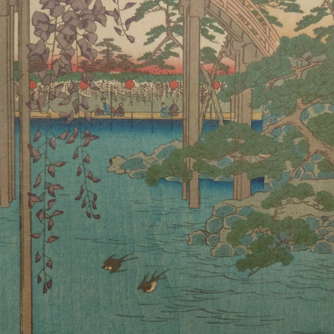 歌川広重の名作「亀戸天神境内」を高品質な和紙ジークレー印刷で細やかに再現し、飾りやすいサイズとシンプルな表装で掛軸に仕立てました。咲き誇る藤棚と神社の風景が、広重独特の構図と色彩で描かれ、江戸の風情を今に伝えます。現代の空間にも調和し、季節の彩りと趣を添える一幅です。