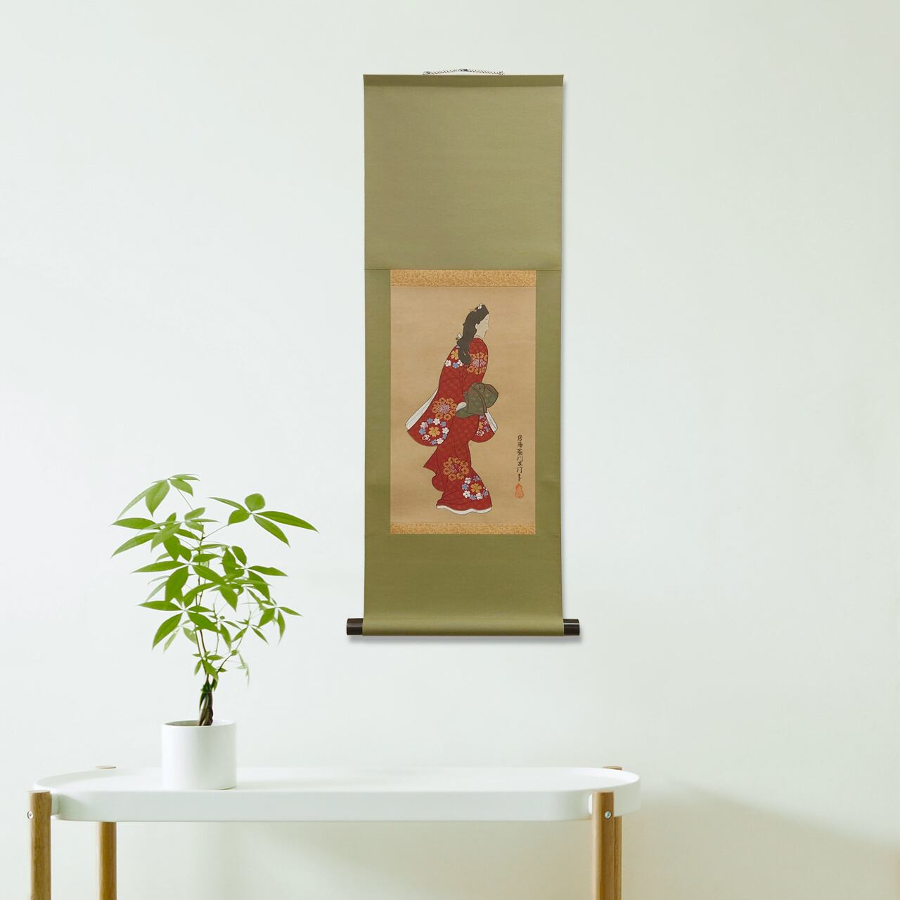 菱川師宣の代表作「見返り美人図」の複製画を、飾りやすいサイズとシンプルで上品な表装で掛軸に仕立てました。振り返る一瞬のしぐさに、江戸の粋と優美さが漂います。和室はもちろん、洋室にも違和感なく調和する、時代を超えた美しさをお楽しみいただける一幅です。