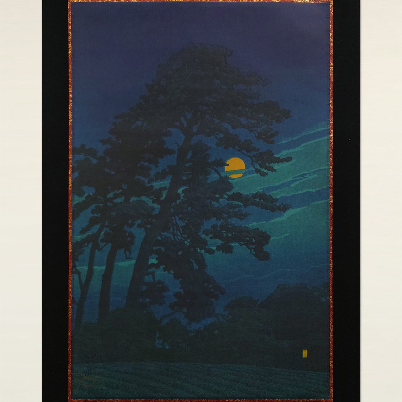 川瀬巴水の名作「馬込の月」を高品質な和紙ジークレー印刷で繊細に再現し、飾りやすいサイズとシンプルな表装で掛軸に仕立てました。深い藍色に包まれた夜空に静かに浮かぶ月、ひっそりと佇む茅葺き屋根の家々が、どこか懐かしく幻想的な風景を描き出しています。静寂と哀愁が漂うこの一幅は、和洋問わず落ち着いた空間に美しく調和します。