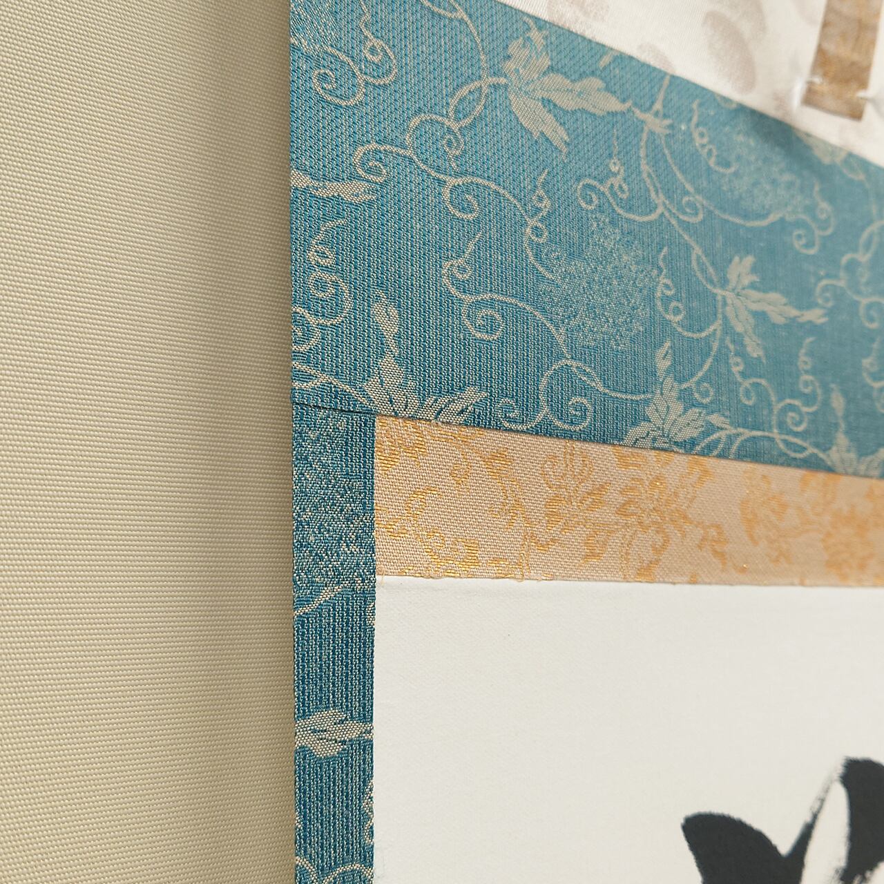 爽やかな青竹色の裂地と、やわらかな象牙色の裂地を組み合わせ、清涼感と落ち着きが調和した上品な一幅に仕立てました。日々の暮らしに、静かなゆとりと品格を添える掛軸です。