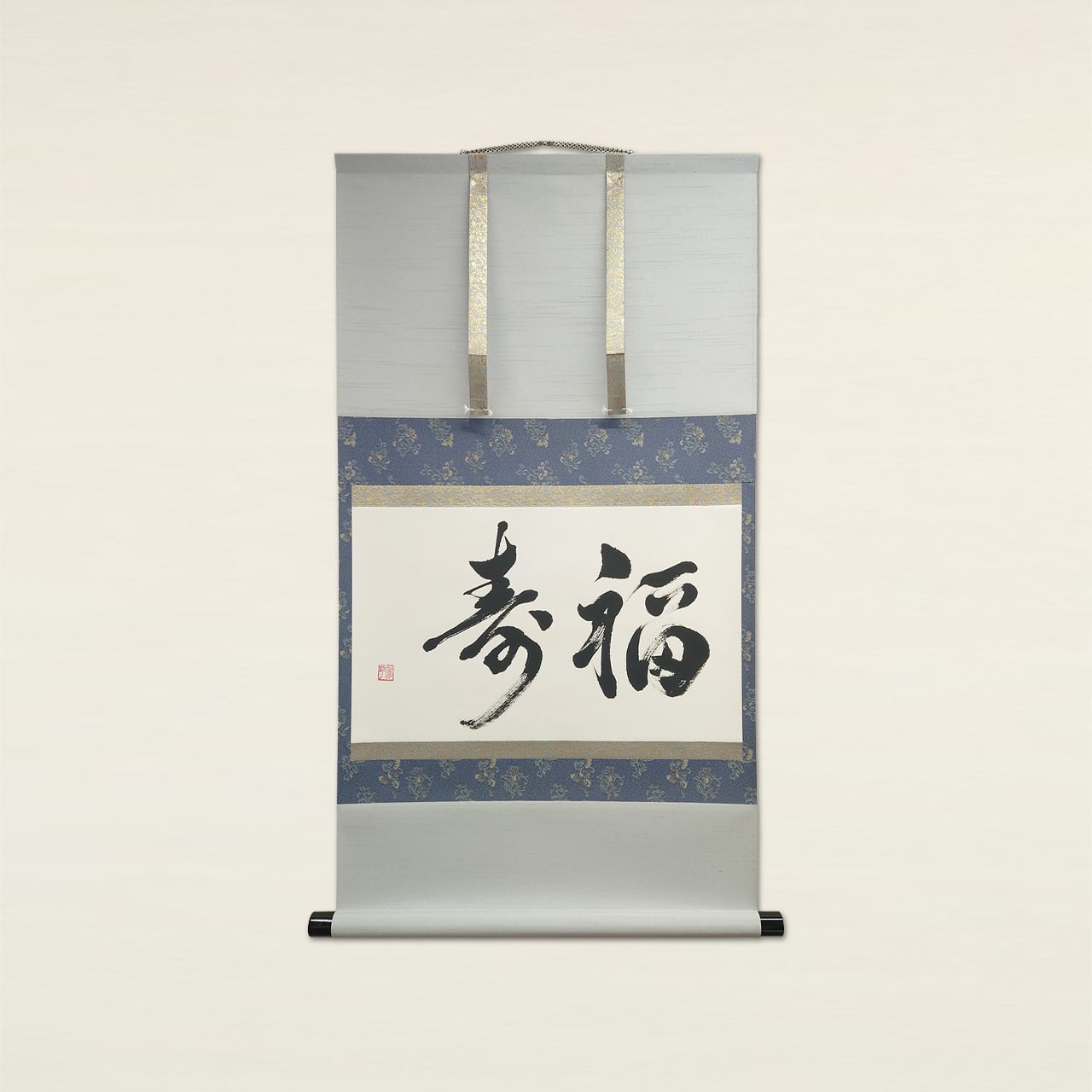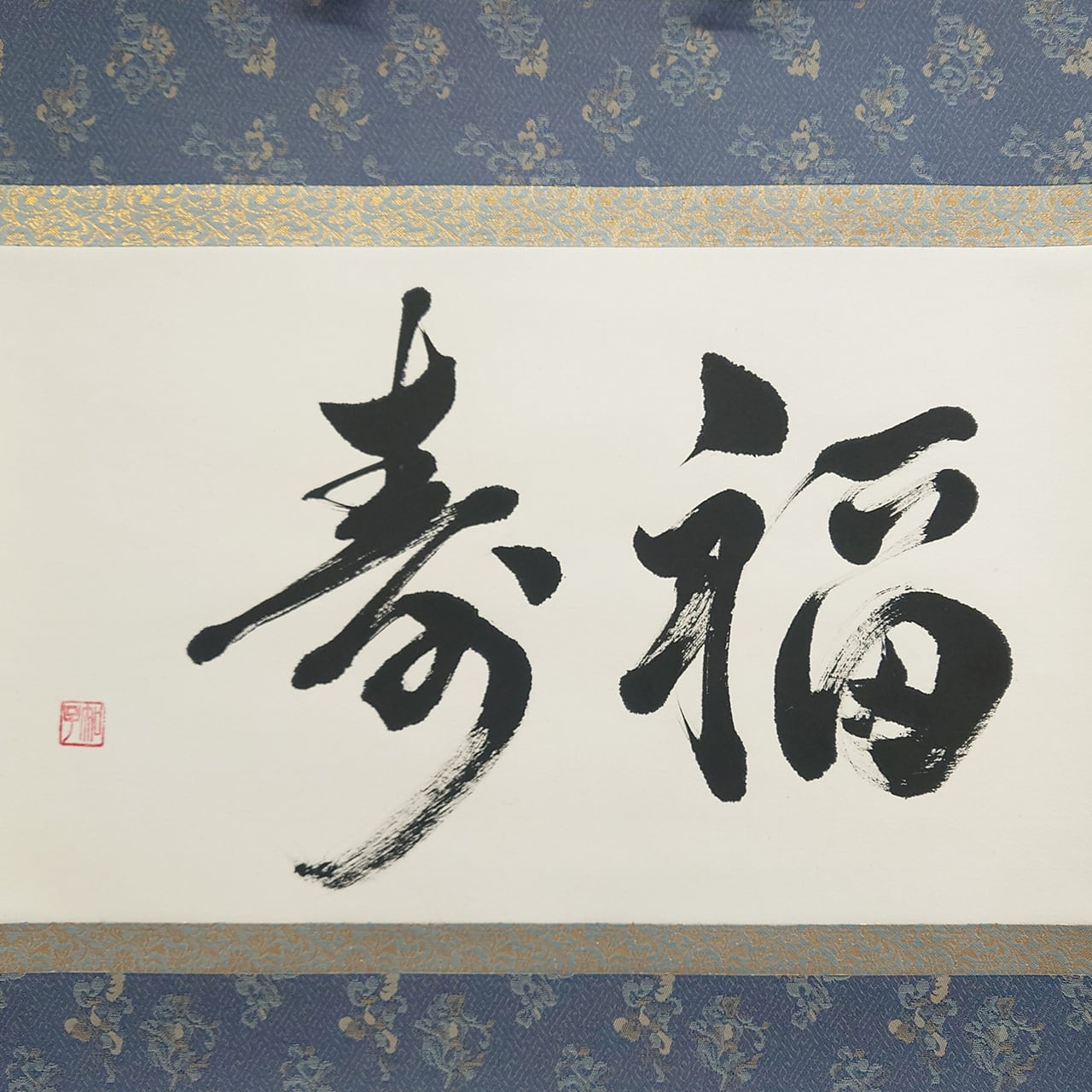 「福寿」は、幸福と長寿をともに願う吉祥の言葉です。力強くも端正な筆致が、書に込められた祈りと気品を感じさせます。青い裂地でさわやかに仕立てた一幅は、和室にもモダンな空間にも調和し、穏やかな運気をもたらします。