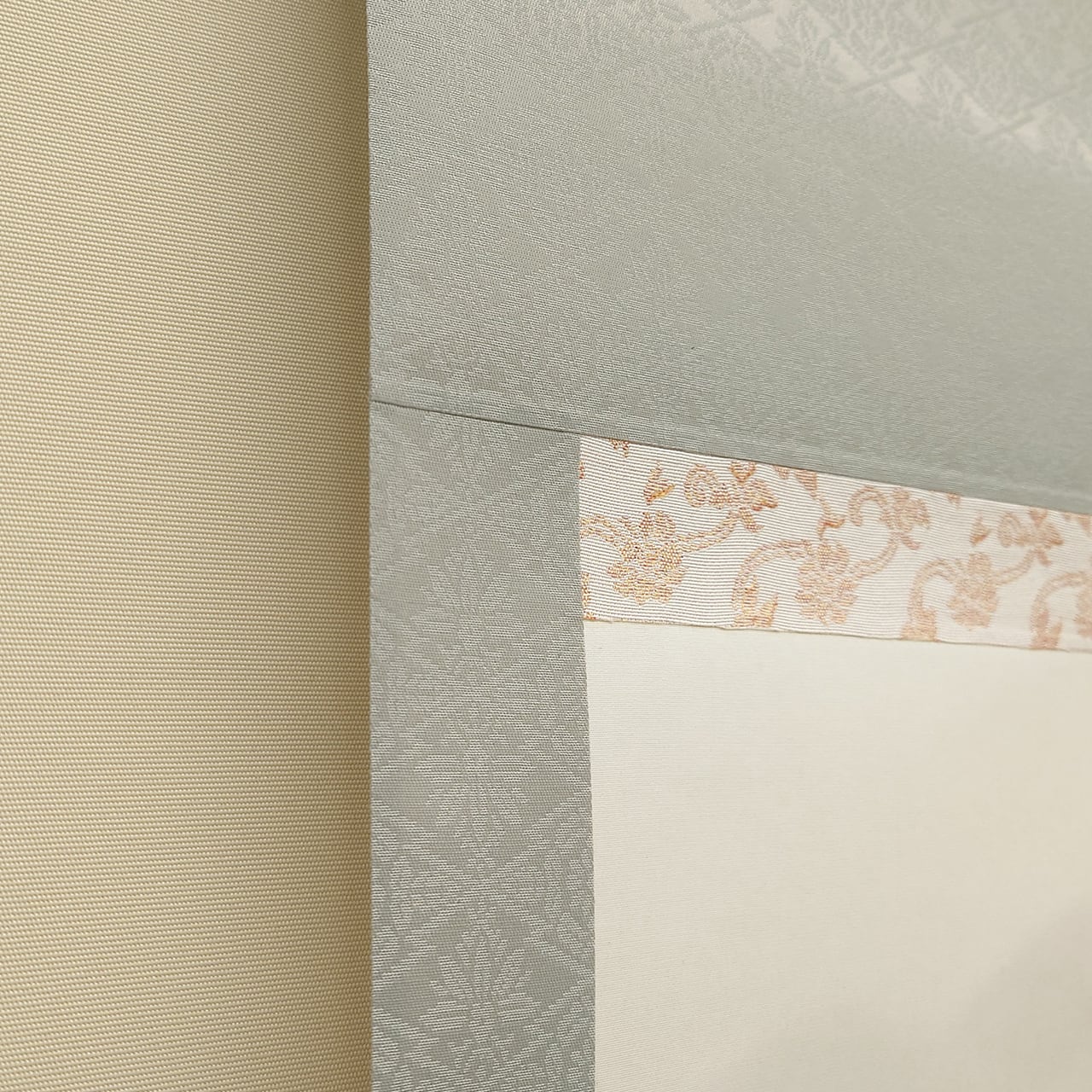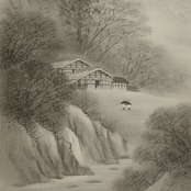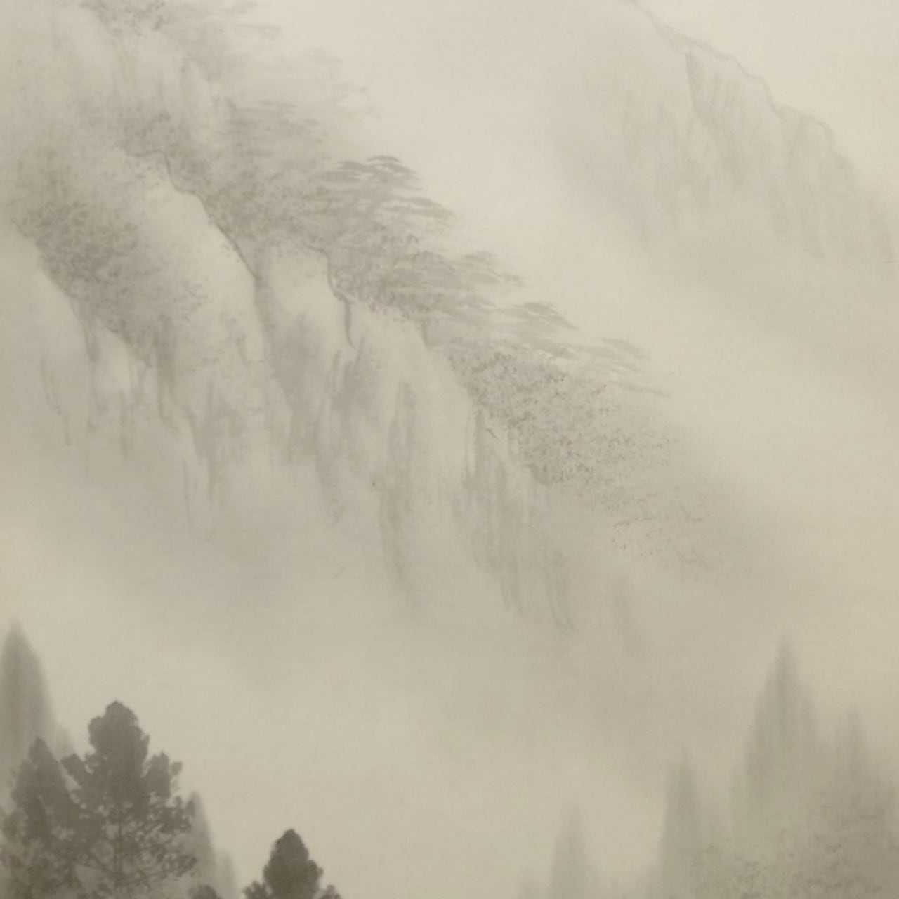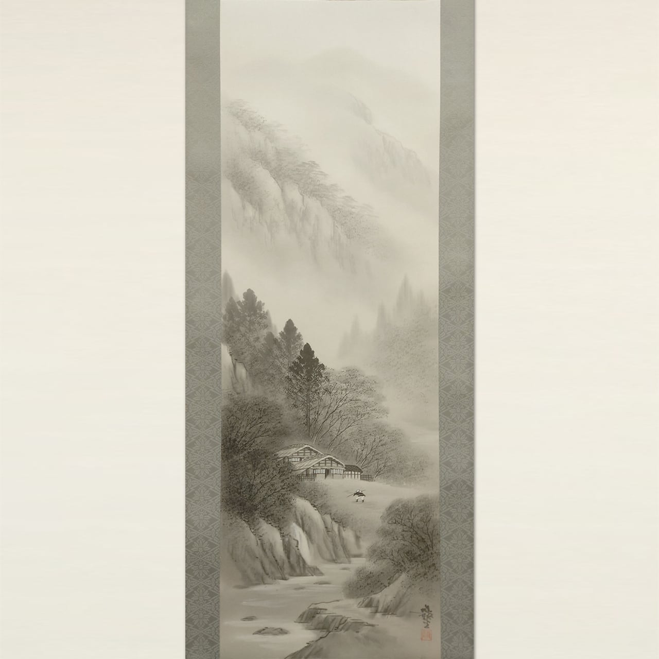山間を包む霧が幾重にも重なり、奥へ奥へと視線を誘う水墨の景。静かに流れる川のほとりには小さな家が寄り添うように建ち、そこに立つ一人の人影が、自然と人の営みのささやかなつながりを感じさせます。墨の濃淡だけで描かれた深い奥行きと静謐な情景が、見る者の心をゆるやかに整えてくれる一幅です。