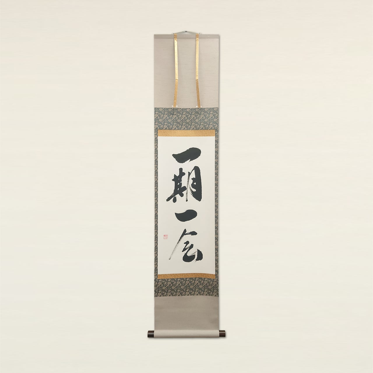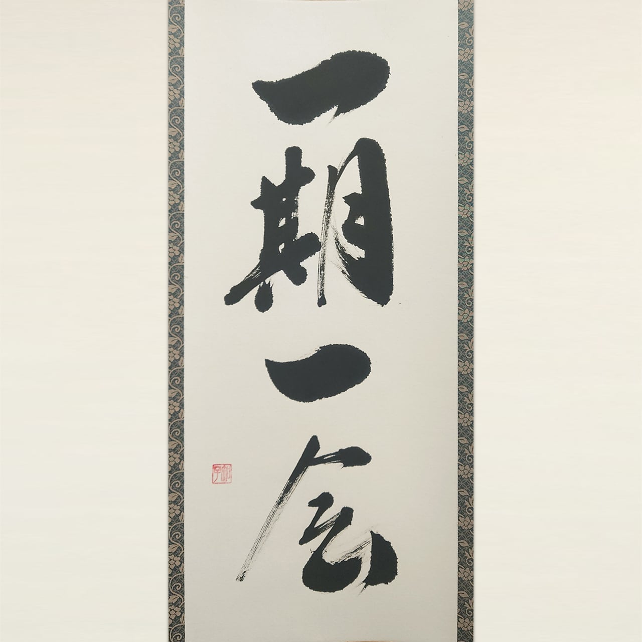 茶の湯の心、そして人生の瞬きを象徴する「一期一会」の書。この一瞬の出会いを尊ぶ精神を、格調高い三段表装で端正に仕立てました。伝統的な様式美のなかに、墨の勢いと余白が響き合う静かな緊張感が漂います。時代を超えて愛される言葉を、暮らしの中で精神を整える一助として、また一期一会の縁を祝う一幅としてお愉しみください。