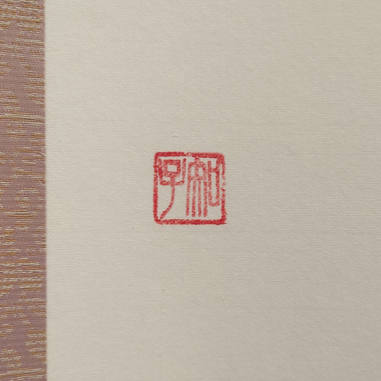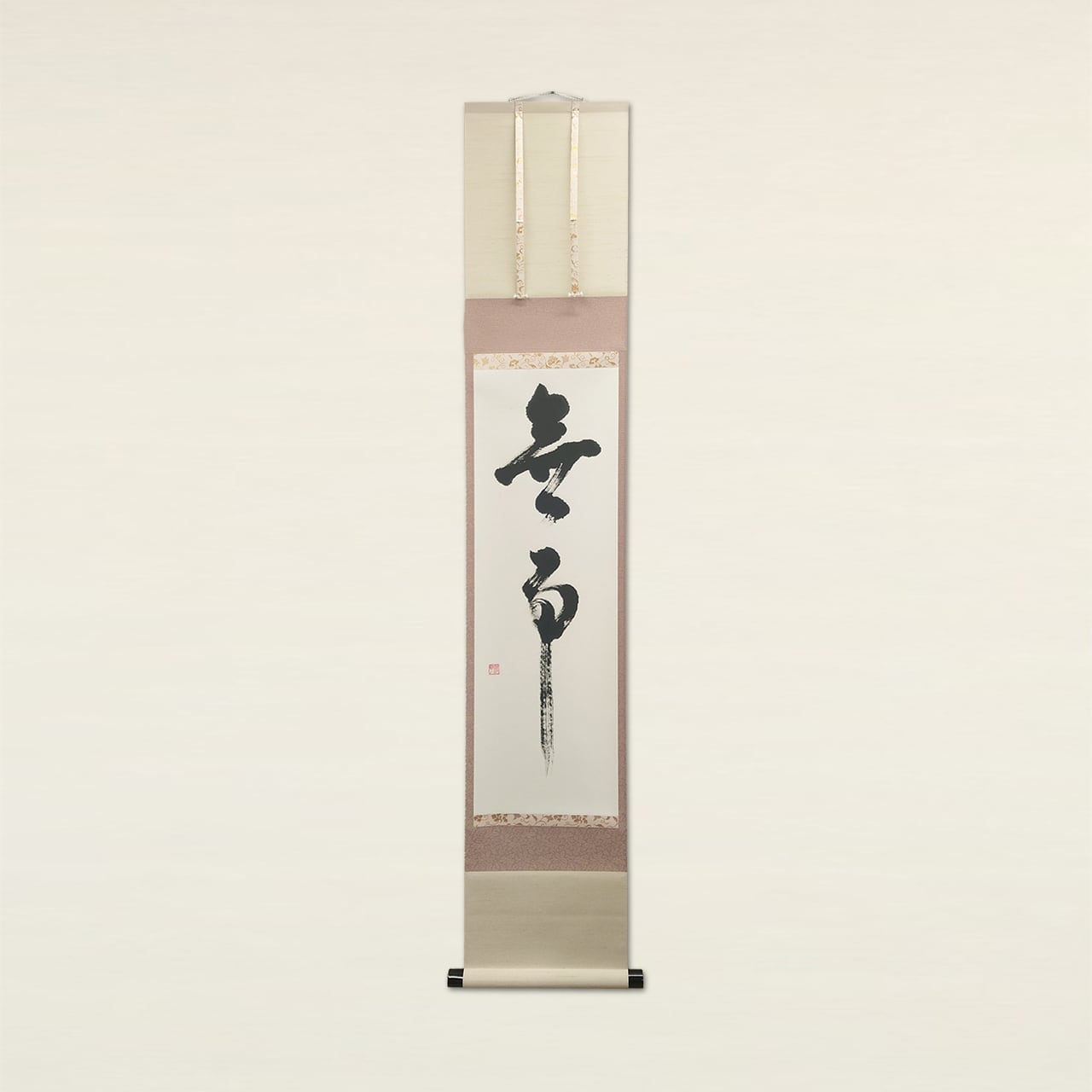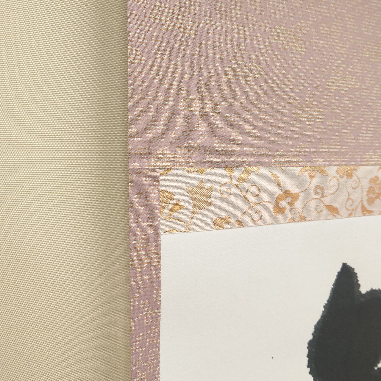 格式高い三段表装に、日常を明るく彩る配色を施しました。お部屋を明るく見せるベージュの天地と、墨の勢いを優しく包み込むピンクの柄物が、伝統的な品格の中に「陽だまり」のような温かみを感じさせます。現代の住空間に馴染む、柔らかな意匠が魅力です。