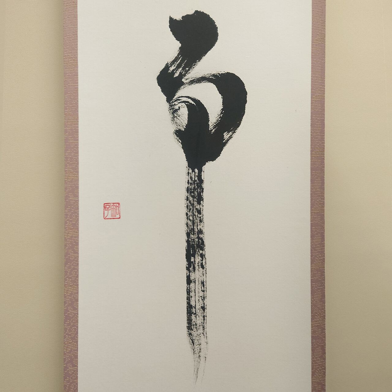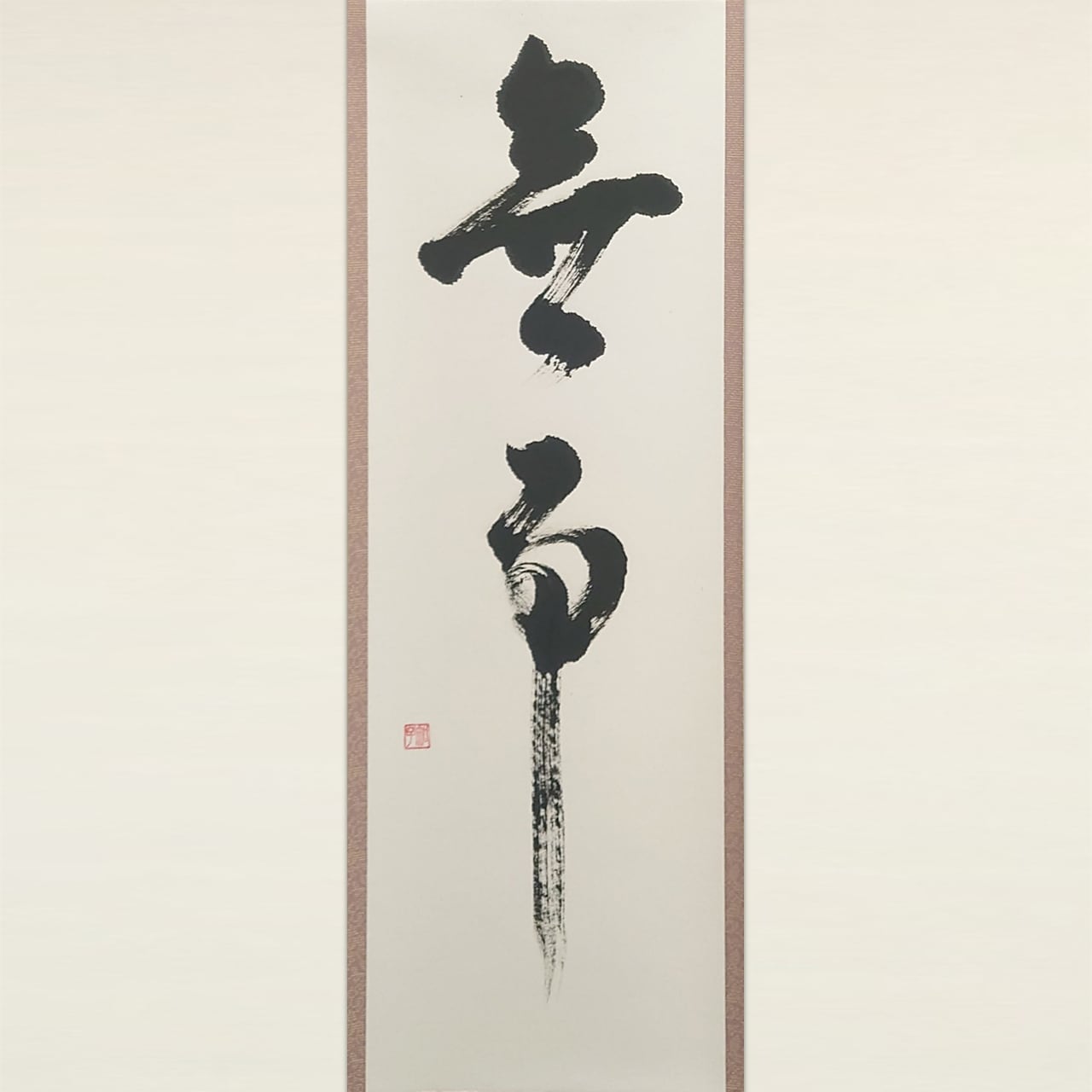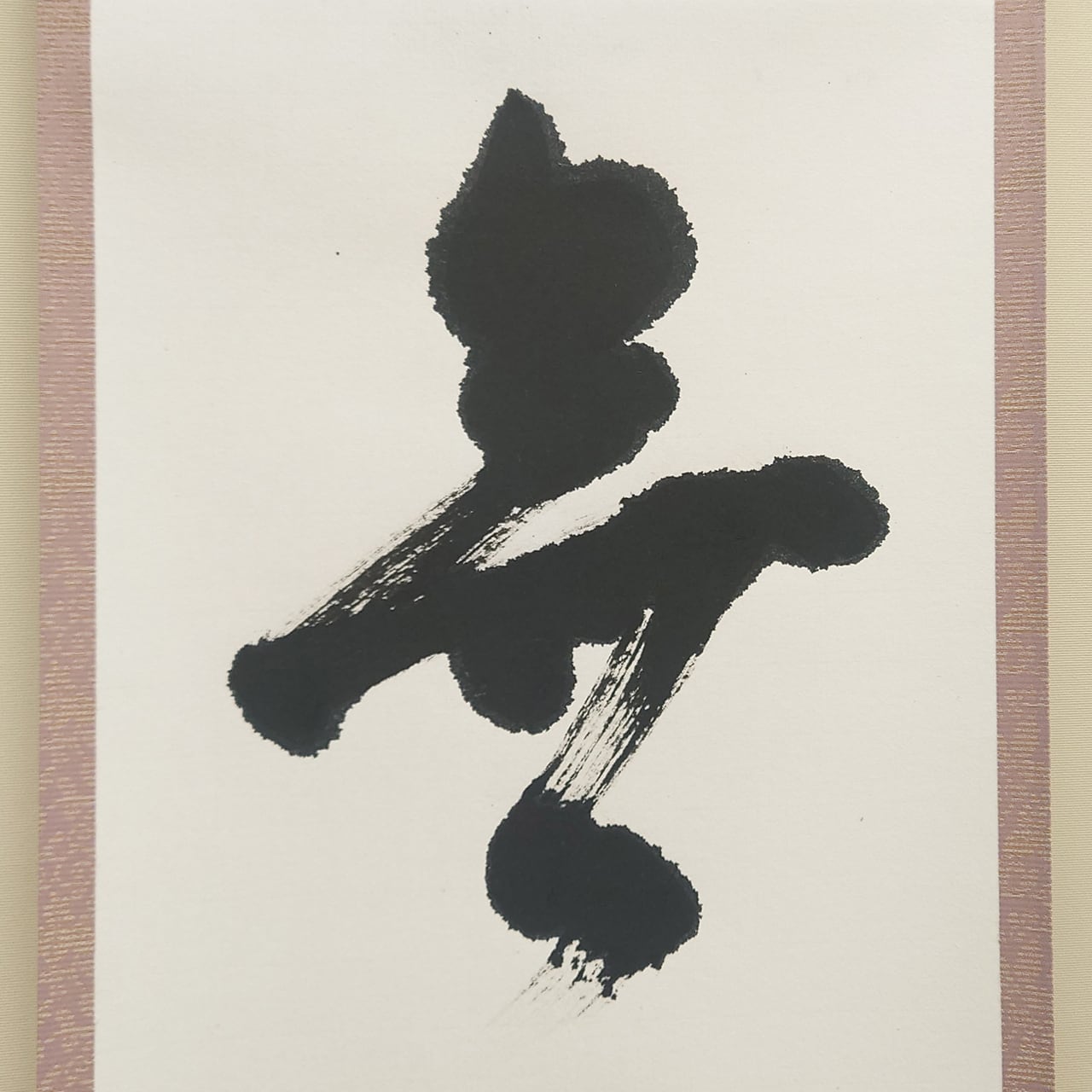 格式高い三段表装に、日常を明るく彩る配色を施しました。お部屋を明るく見せるベージュの天地と、墨の勢いを優しく包み込むピンクの柄物が、伝統的な品格の中に「陽だまり」のような温かみを感じさせます。現代の住空間に馴染む、柔らかな意匠が魅力です。